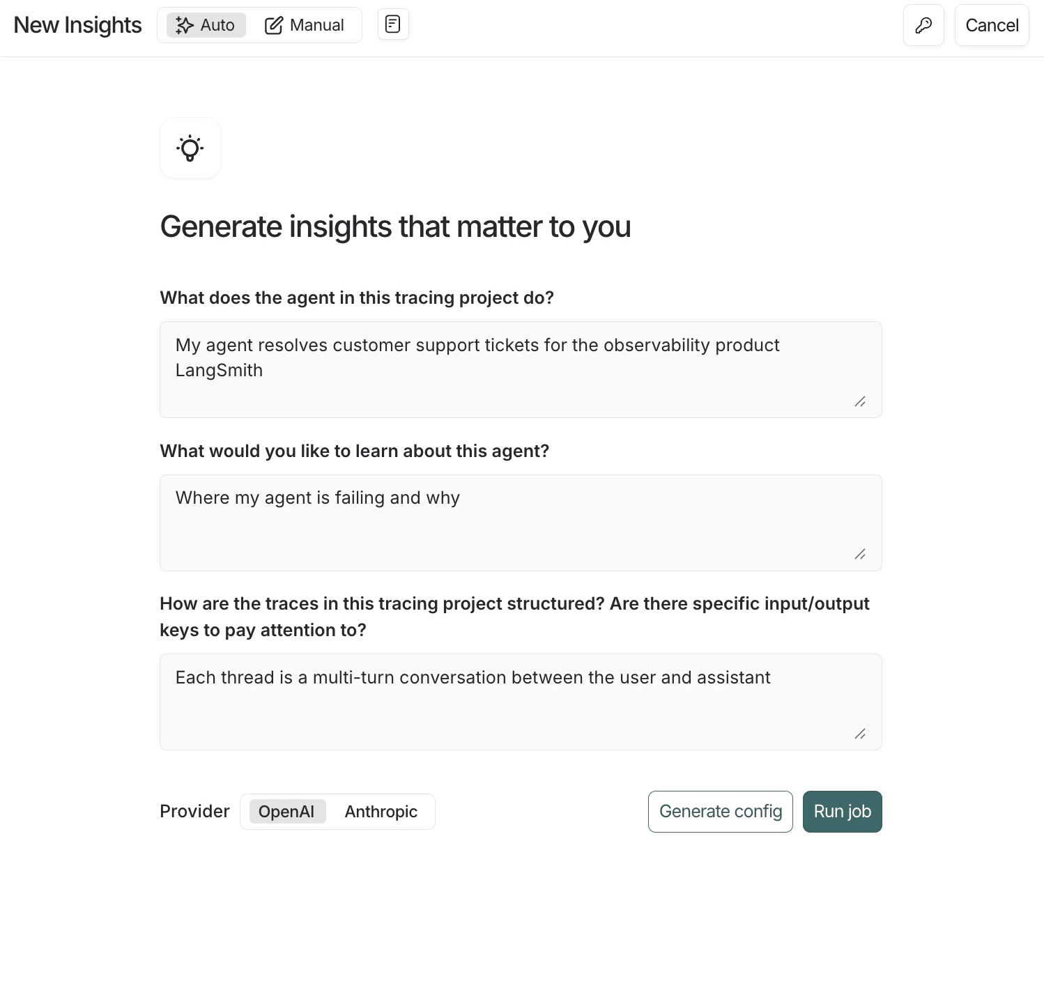 - Answer the natural-language questions about your agent’s purpose, what you want to learn, and how traces are structured. Insights will translate your answers into a draft config (job name, summary prompt, attributes, and sampling defaults).